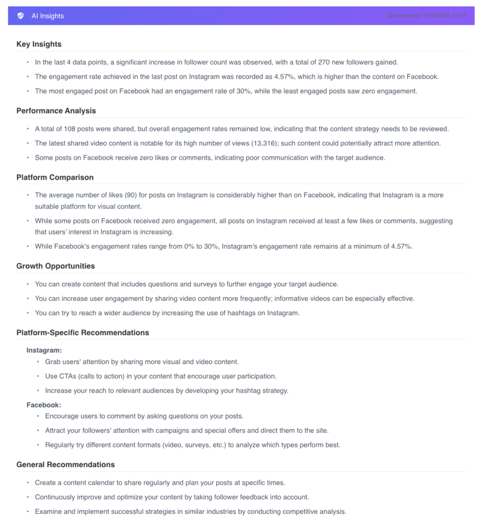 – Social Media Insights: Dive deep into performance analysis, key insights, platform comparisons, growth opportunities, and tailored recommendations. Offer this as an exclusive feature for your premium users.