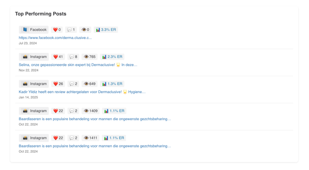 – Top Performing Posts: Highlight your best content within a chosen time range.