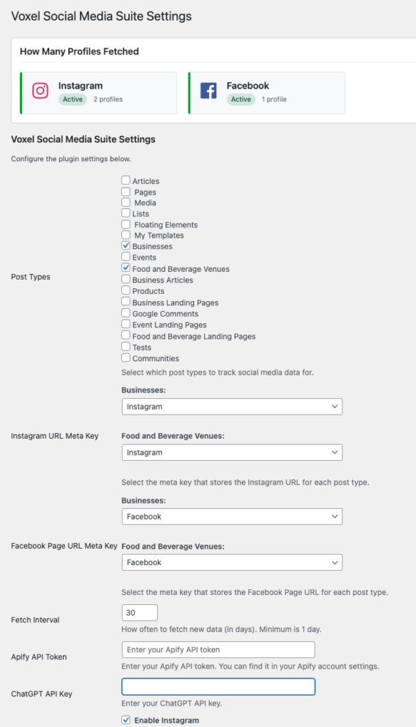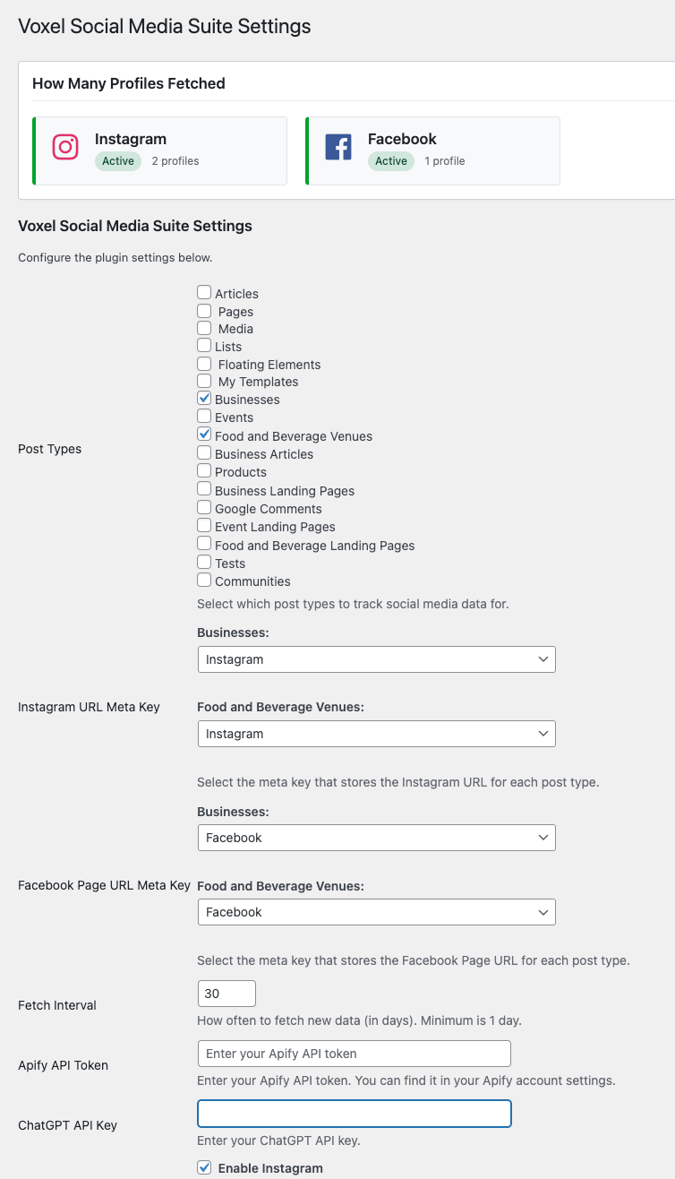 Simply add the social media URL fields to your Voxel post types. Post authors only need to enter their social media URLs—no additional authentication required. The plugin scans all your selected post types, validates URLs, fetches profile data and posts, and then uses AI to generate comprehensive reports.