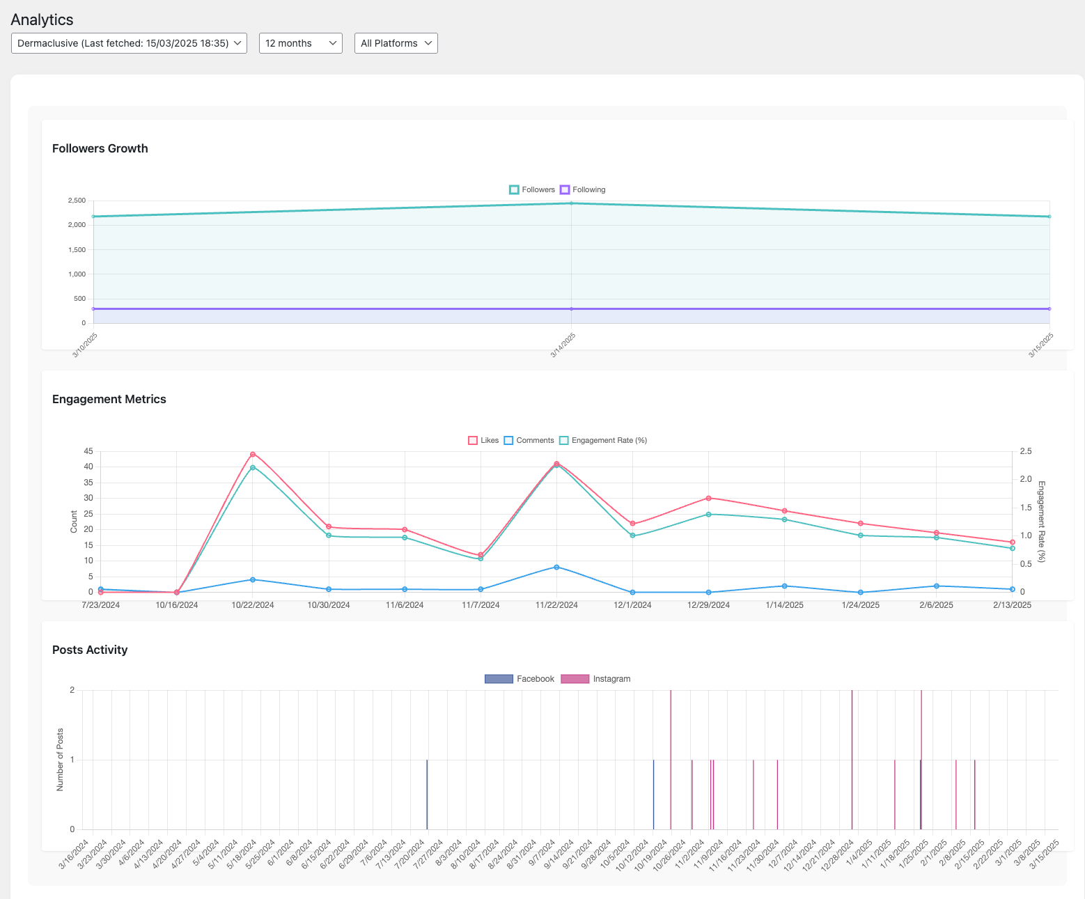Admins can view all fetched data with powerful visualizations. Filter results by date range and platform, manually trigger data updates for specific posts, or generate Social Media Insights on demand.